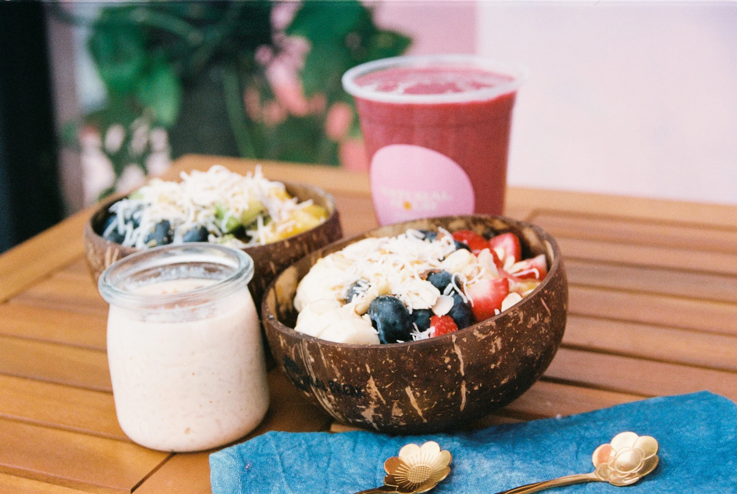 Toppings to choose from: granola, coconut, almonds, seasonal fruits (strawberry, pineapple, blueberries, kiwi), honey